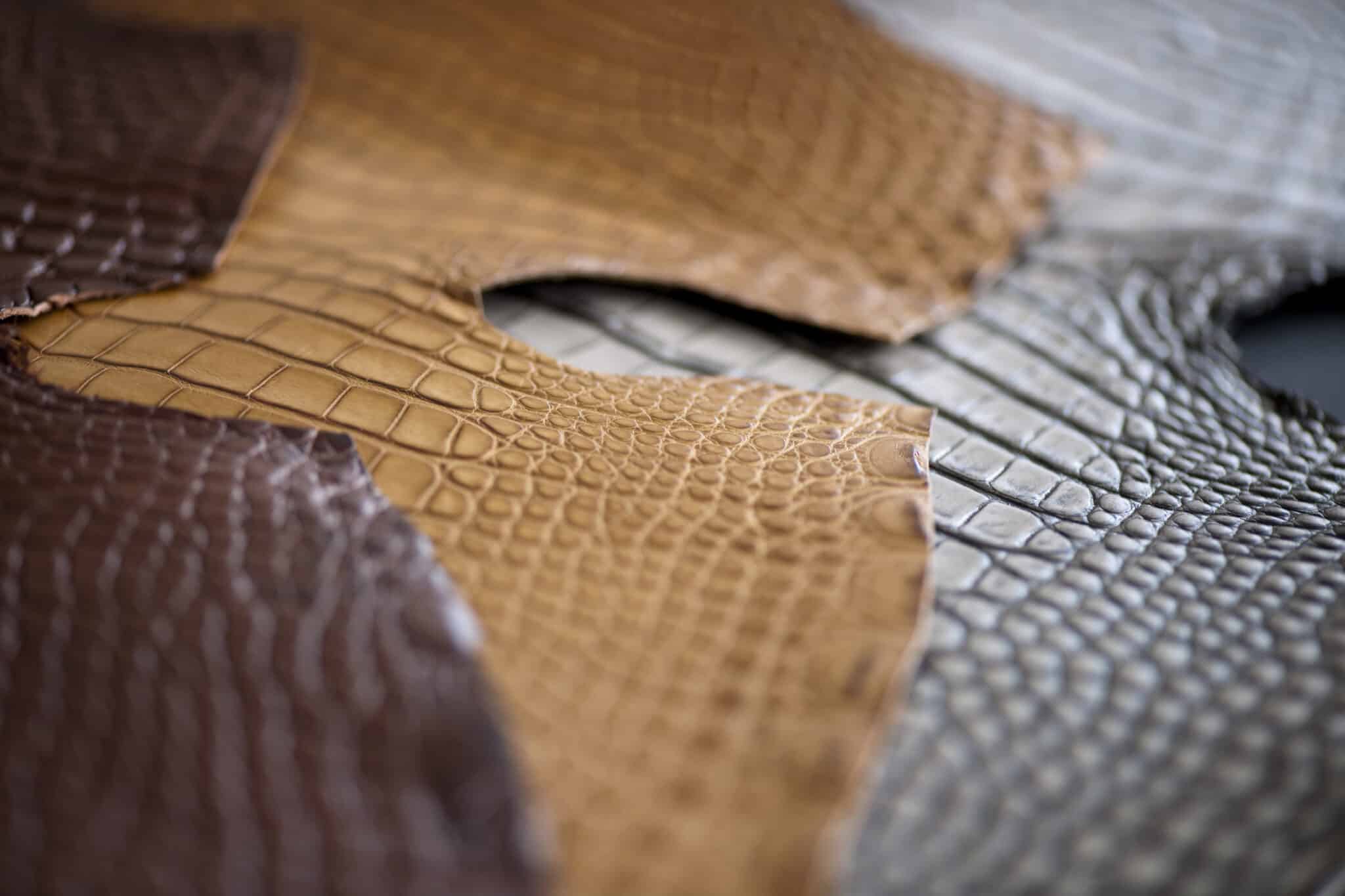 • Peaux exotiques (alligator, lézard, galucha…) : issues d’élevages certifiés, tracées, conformes CITES